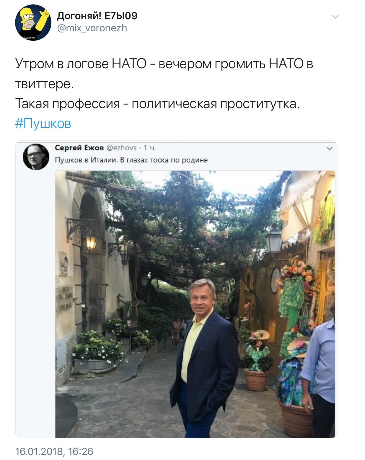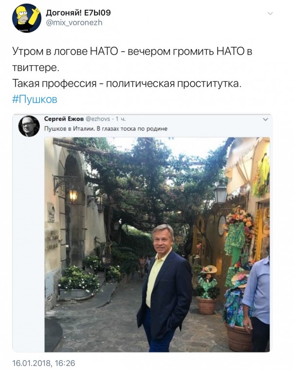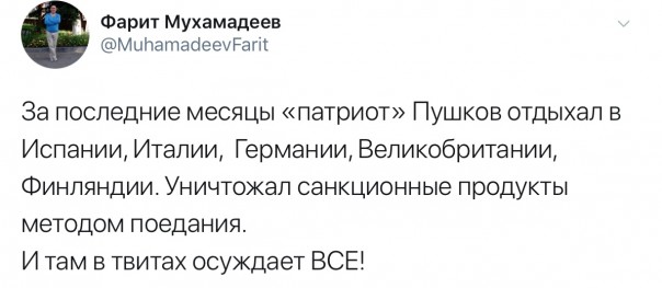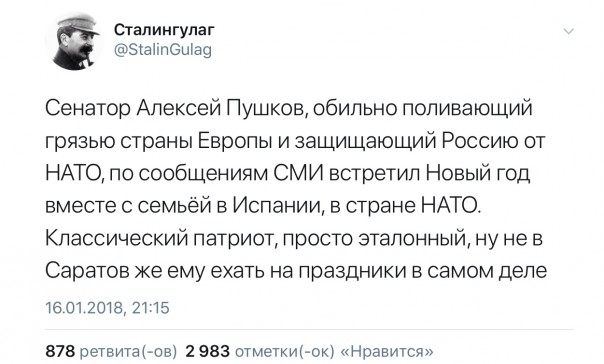 В общем, в довольно небольшом по объёму материале было написано достаточно для того, чтоб через несколько часов после его публикации собрать солидный урожай из классовой ненависти, проклятий в адрес Путина и нецензурных оскорблений лично в адрес Пушкова.