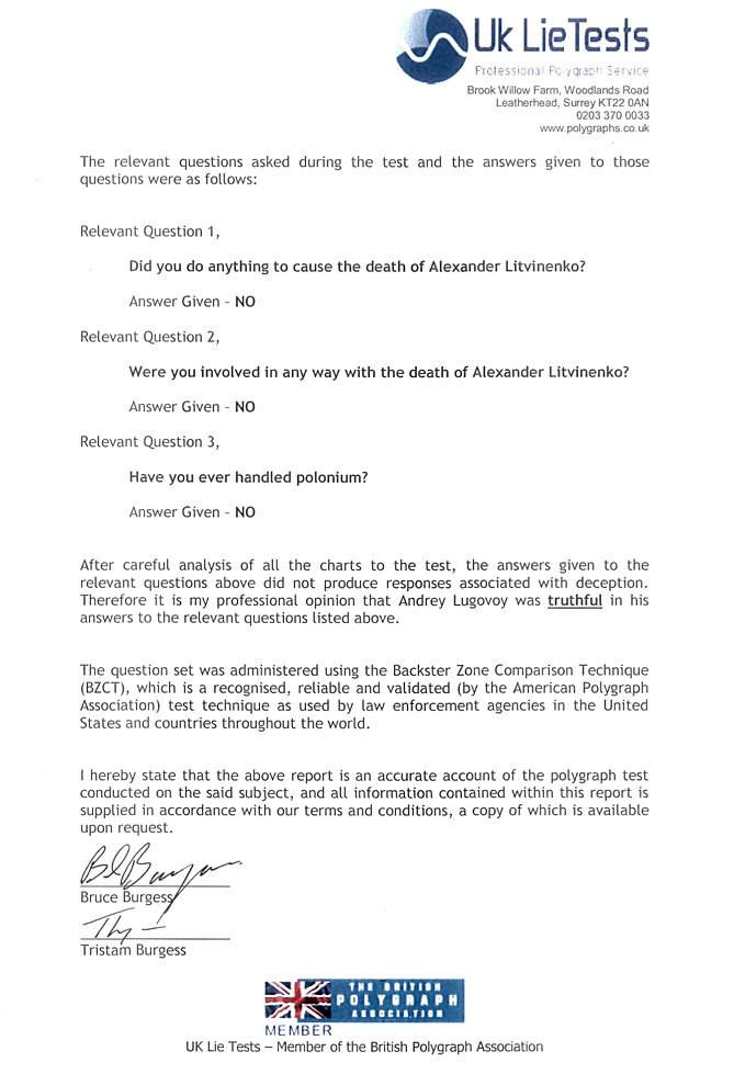 Депутат Госдумы Андрей Луговой заявил, что британские эксперты проверили на полиграфе в Москве его показания по делу о смерти экс-сотрудника ФСБ Александра Литвиненко и пришли к выводу, что Луговой не причастен к этому.