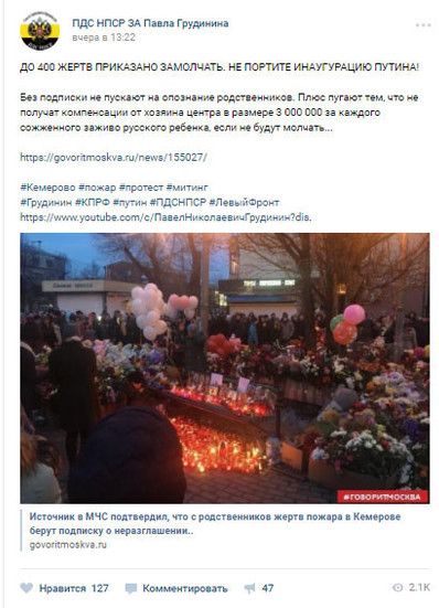 В частности, как выяснилось накануне, вбросами относительно "многих сотен" погибших в пожаре в ТРЦ занимался украинский пранкер Евгений Вольнов, против которого сегодня Следственный комитет России возбудил уголовное дело. Вместе с тем фейки о сотнях погибших при пожаре подхватили многие российские видеоблогеры, в частности, Николай Соболев. Впрочем, вскоре они опубликовали опровержения и извинения, а также удалили соответствующий провокационный контент. Однако в дни, последовавшие за пожаром 25 марта, паблики экс-кандидата от КПРФ Павла Грудинина активно подключились к распространению дезинформации о количестве жертв в Кемерове.