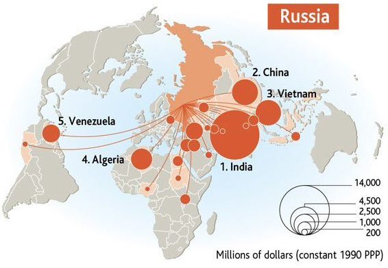 Россия по-прежнему будет занимать уверенное второе место, постепенно сокращая разрыв с лидером. В основном благодаря расширению традиционных каналов, например, сбыта в Индию. В том числе и потому, что успехи Китая в Дели трактуются как угроза, требующая ответа и поиска альтернативных союзников. Особенно на фоне укрепления Пакистана. Не последнюю роль в этом играет и тот факт, что успех китайской экспансии происходит в значительной степени за счёт выталкивания с рынка французов (авиация, ракеты, электроника) и немцев (танки, бронетехника, инженерные машины, электроника, РЭБ, средства противотанковой борьбы). И если в сегменте бронемашин позиции немецкого ОБТ «Леопард-2» ещё сильны, то французский «Леклерк» рынок теряет из-за общей дороговизны и чрезмерной эксплуатационной сложности, особенно в части бортовой электроники. А в сегменте авиационного оружия сегодня, кроме китайской, остаются всего две альтернативы: США и РФ. Кроме французского истребителя «Рафаль», Европе больше предложить нечего. Проект «Еврофайтера» окончательно закрыт. В случае если французам не удастся выиграть контракт с ВВС Индии, производство собственных боевых самолётов в Европе прекратится.