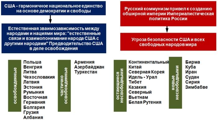 Так как империалистическая политика коммунистической России привела путем прямой и косвенной агрессии к порабощению и лишению национальной независимости Польши, Венгрии, Литвы, Украины, Чехословакии, Латвии, Эстонии, Белоруссии, Румынии, Восточной Германии, Болгарии, континентального Китая, Армении, Азербайджана, Грузии, Северной Кореи, Албании, Идель-Урала, Тибета, Казакии, Туркестана, Северного Вьетнама и других