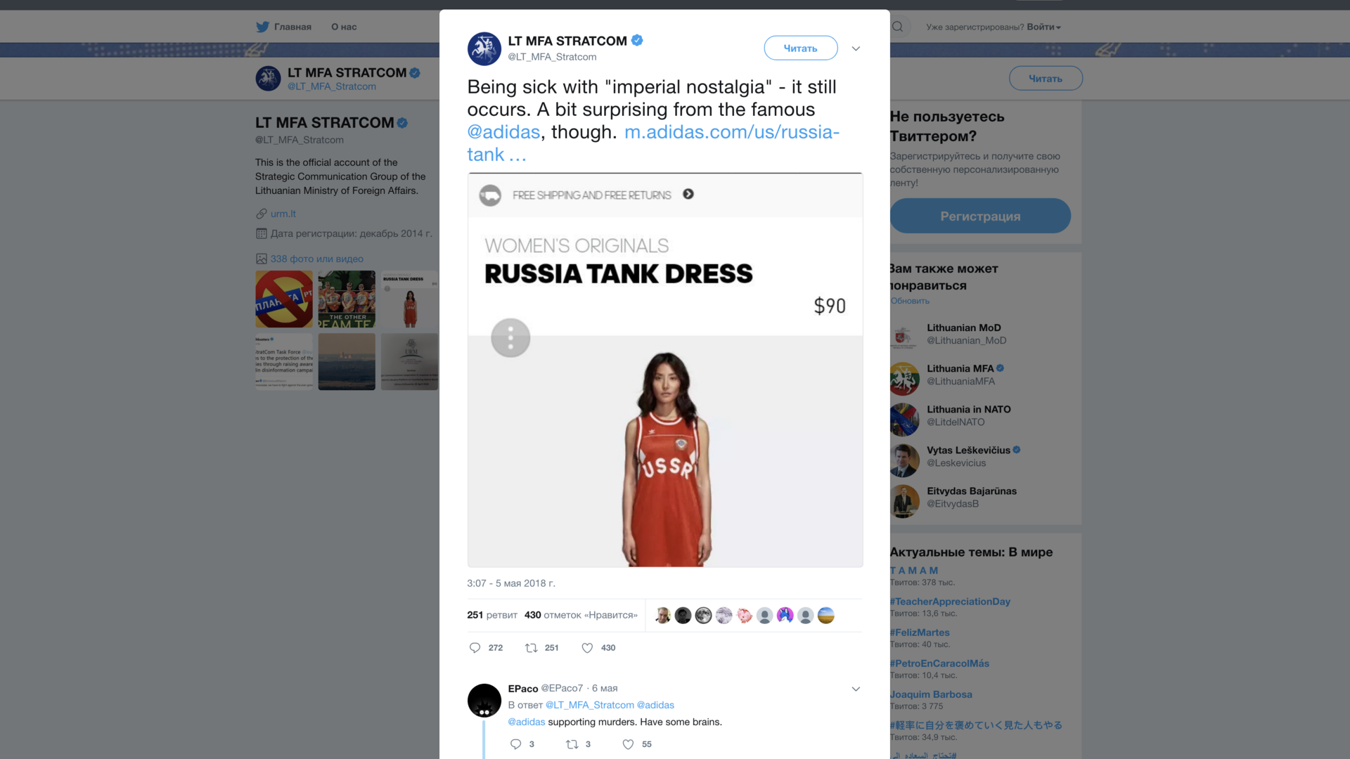 «Всё ещё есть те, кто болен ностальгией по империи. Как-то неожиданно, что среди них известная компания Adidas», — отметили в МИД Литвы.