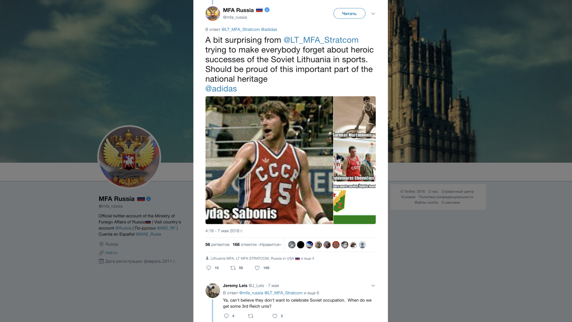 На следующий день МИД России ответил литовским дипломатам, написав в Twitter, что в прошлом литовские спортсмены выступали именно в форме СССР. Ведомство дополнило запись фотографиями советских олимпийских чемпионов литовского происхождения — Арвидаса Сабониса, Шарунаса Марчюлениса и Вальдемараса Хомичюса. В российском МИД выразили удивление тем, как литовское внешнеполитическое ведомство пытается предать забвению спортивные достижения Литвы в советский период, хотя это является частью национального наследия.