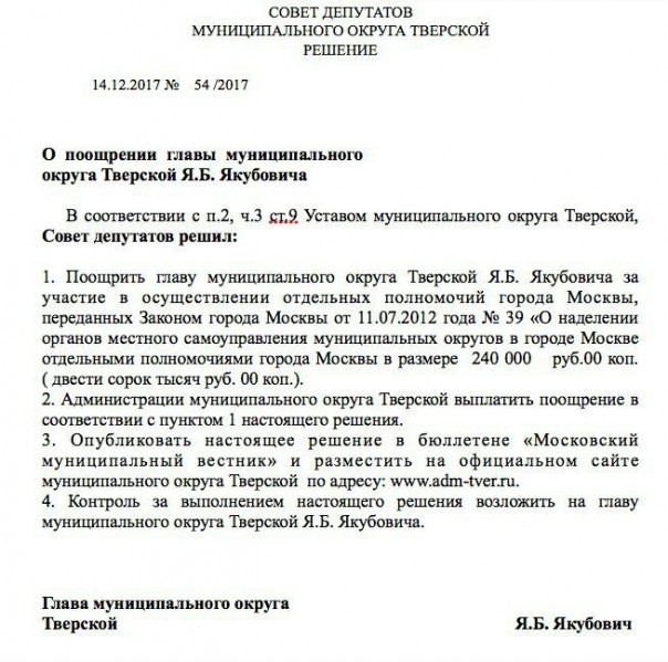 Так обнаружился удивительный документ, согласно которому в декабре 2017 года председатель Совета депутатов муниципального округа Тверской Яков Якубович выписал сам себе квартальную премию в 240 тысяч рублей. Это тот самый Якубович, который выиграл на днях яблочные праймериз на право выдвинуться кандидатом от партии в мэры в Москвы и... уступил это право Сергею Митрохину.