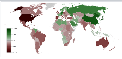 Два главных донора Запада (Китай и Россия) ведут активную работу по уходу от тотальной зависимости банковской системы. Например тут частично перечислен пул мероприятий. Ниже график цветовой градации стран по торговому балансу. Зеленое - положительный баланс, Коричневый - отрицательный.