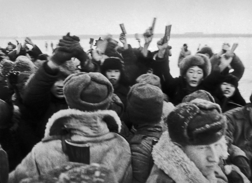 Советско-китайский пограничный конфликт в 1969 году. Бесчинствующая толпа хунвэйбинов с цитатниками Мао Цзэдуна пытается ворваться на территорию СССР. Кадр из фильма "Что случилось на Уссури".