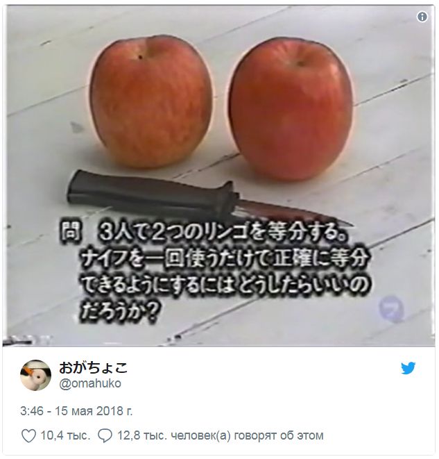 Пользователь "Твиттера" с ником omahuko предложил решить подобную задачку. Согласно условию, есть три человека, два яблока и один нож. Нужно поделить яблоко на всех участников эксперимента, используя нож только один раз.
