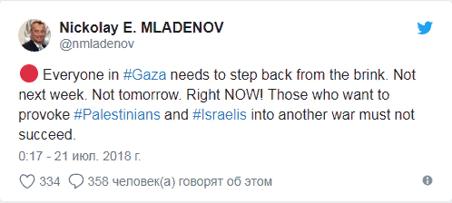 «Все в Газе должны сделать шаг назад от края пропасти. Не на следующей неделе. Не завтра. Прямо сейчас! Те, кто хочет спровоцировать палестинцев и израильтян на ещё одну войну, не должны преуспеть», — написал Младенов.