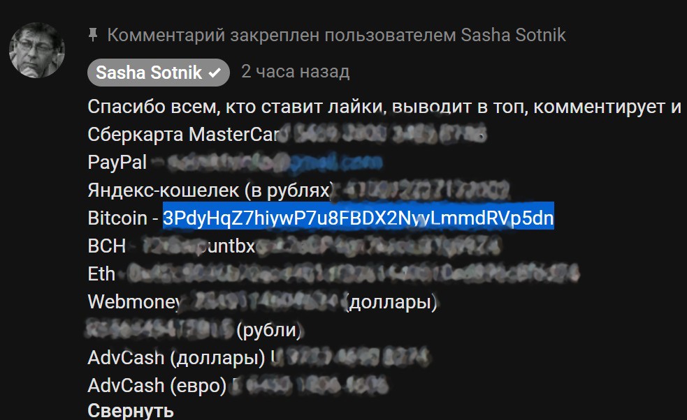 Тут я предложил бы потрогать видеоблогера-русофоба за больное, а именно за его кошелек. По поводу и без повода Сотник, буквально на каждом углу развешивает свои реквизиты. Реквизитов много, что называется на все случаи жизни, в том числе присутствует и адрес куда Сотникопоклонники могут заслать криптовалют.