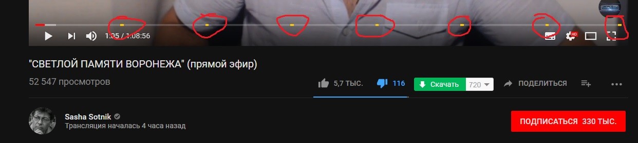 Тут конечно возникают вопросы. Например: кто это Саше криптовалюту посылает? С учетом того, что аудитория данного блогера в том, как работают «интернеты» безграмотна от слова совсем. Иначе бы у Саши не выходило так удачно раз за разом «вешать на уши» про «срезание просмотров» и регулярное отключение «монетизации на видео». Про то, что видео монетизируются можно узнать по желтым точкам (рекламные вставки) на шкале времени.