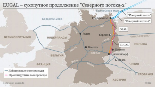 Дело в том, что параллельно OPAL «Газпром» и его немецкий партнер Wintershall (доли в совместном предприятии 50/50) сооружают EUGAL — газопровод мощностью 55 млрд кубометров в год, который примет газ из второй очереди «Северного потока». Если кто забыл, у СП – 2 та же мощность.