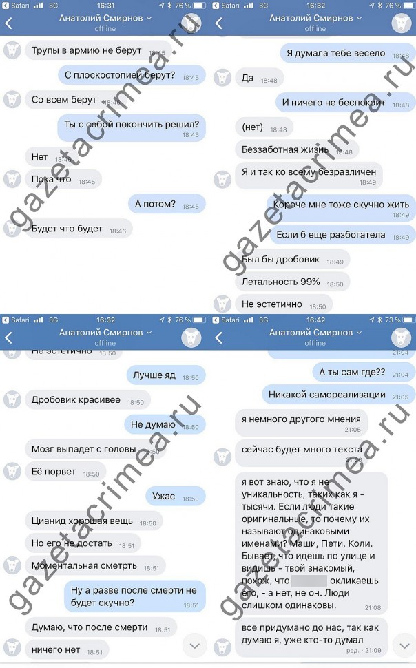 Исходя из переписки, семья и школа по разным причинам оказались не в состоянии дать ему цель в жизни, если уже длительное время он витал в суицидальных фантазиях. Источник