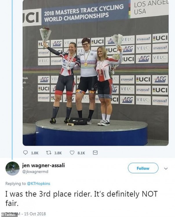 А именно: она раскритиковала чемпионку, по совместительству профессора феминистской философии Чарльстонского университета Рейчел МакКиннон. Опубликовав в Twitter фото победительницы на пьедестале почета, Джен Вагнер приписала: "Это просто нечестно".