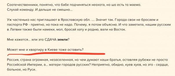 Ещё нюанс. Когда речь заходит о предоставлении российского гражданства жителям ЛДНР, тут же в соцсетях поднимается вой на тему «все уедут, Донбасс превратится в пустыню». Когда же речь заходит о возможном переезде соотечественников из Украины - всплывают материальные вопросы, типа квартиры в Киеве,