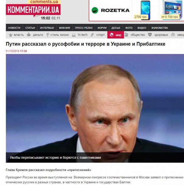 Особенно это касается заявлений ВВП в отношении Украины. Тут просто истерика у профессиональных «русских». И вот опять… В последний день октября президент РФ, выступая на конгрессе соотечественников, проживающих в зарубежье, сказал крамольное. У украинских СМИ сразу истерика: