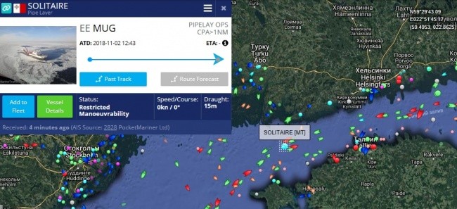 По данным Marinetraffic, сейчас на маршруте строительства «Северного потока-2» работают два трубоукладочных судна компании Allseas — Audacia и Solitaire. Первое находится в экономической зоне Германии, второе — у берегов Финляндии.