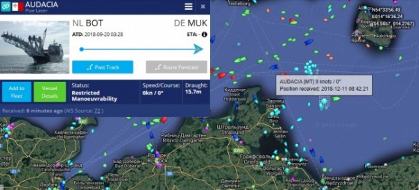 Расположение трубоукладчика Audacia немного севернее маршрута, возможно, говорит о том, что «Северный поток-2» готовятся уложить севернее датского острова Борнхольм — по альтернативному маршруту. Дания — единственная страна, которая еще не дала согласия на укладку газопровода в своих территориальных водах.