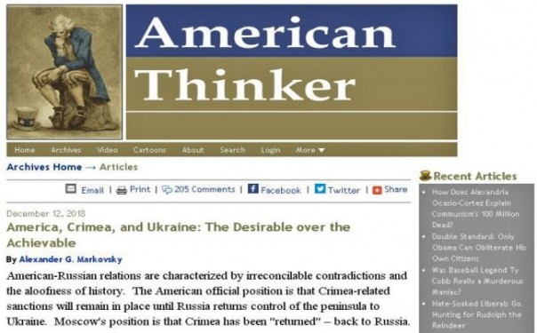 «Вильсоновские (Томас Вудро Вильсон – президент США в 1913-1921 гг. – Ред.) принципы национального самоопределения должны применяться к Крыму и востоку Украины так же, как они применялись к Югославии, Чехословакии, Шотландии, Фолклендским островам и Кипру», – заявляет автор статьи в American Thinker. Сторонники жёсткой враждебной линии в отношении России, по его мнению, утратили связь с реальностью.
