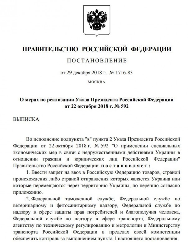 И вот сегодня — 29 декабря 2018 года — РФ наносит нынешнему украинскому бизнес-политсообществу «удар под дых», введя запрет на импорт в Россию длинного списка традиционных для экспорта в РФ украинских товаров.
