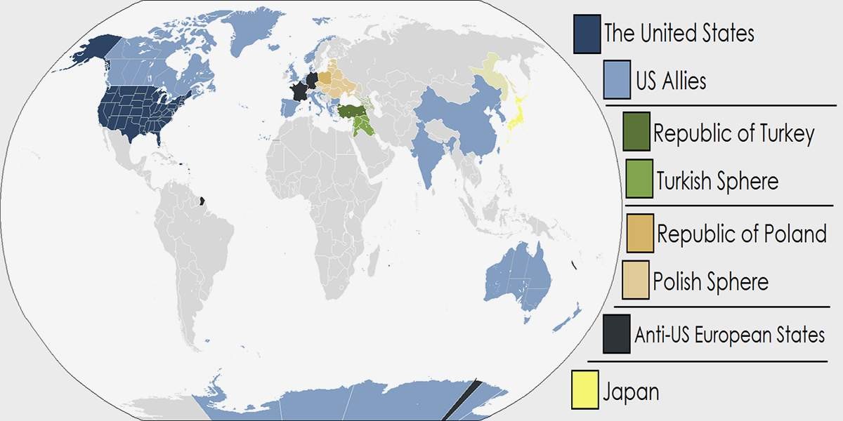 На стороне США выступят Великая Польша и Великобритания. «Старая Европа» в лице немцев и французов станет воевать на стороне японцев и турок.