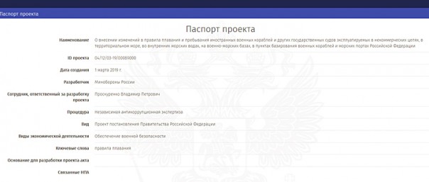 Непонятно, откуда уважаемая газета «Известия» взяла, что «Россия берёт под защиту Северный морской путь», и «Правительство разработало правила прохода по нему иностранных военных кораблей. В «Паспорте проекта», всего лишь размещённом на правительственном сайте проектов нормативных актов (то есть когда ещё дойдёт до дела!), обозначено чёрным по белому, что разработчиком проекта является Минобороны РФ: