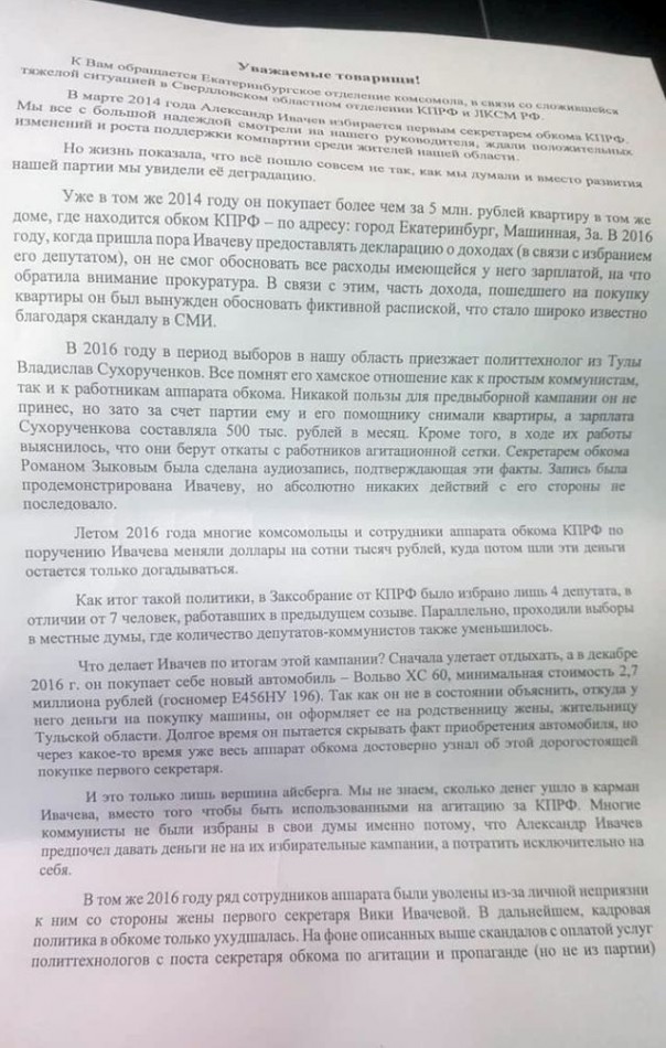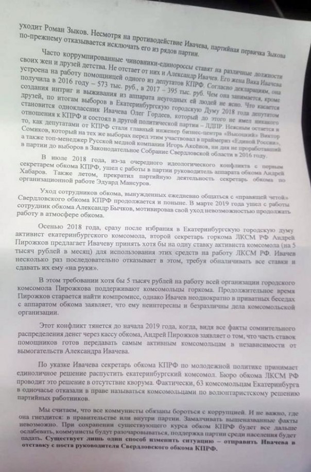 В качестве дополнительной иллюстрации того, что КПРФ окончательно превратилась в Коммерческую Партию РФ, можно привести свежий скандал в её свердловском обкоме. Там комсомольцы обвиняют лидера областной организации в незаконных доходах, отмывании денег, непотизме, продаже мест в списках, финансировании деятельности партии «долларами в конвертах» и так далее.