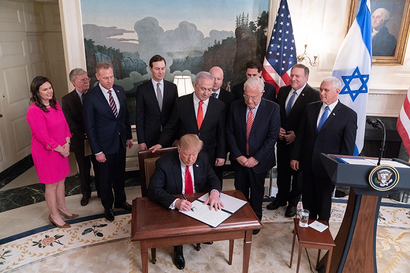 Он совершает ничего не значащие демонстративные шаги. Он «дарит» Израилю то, что у него и так уже есть. Но он делает это так, что весь остальной мир начинает смотреть на еврейское государство, мягко говоря, с неодобрением. Впервые за многие десятилетия страны ЕС единым фронтом высказались против признания израильского суверенитета над Голанскими высотами. А уж как неистовствуют арабы!