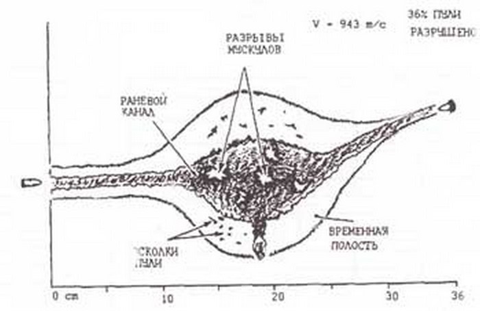 Учитывая неоднородность строения тканей, мы получим весьма сложный характер ранений, наносимых такими пулями. Наиболее тяжелые повреждения тканей пулями боеприпаса 7Н6 происходят на конечном участке движения на глубине более 30 см.