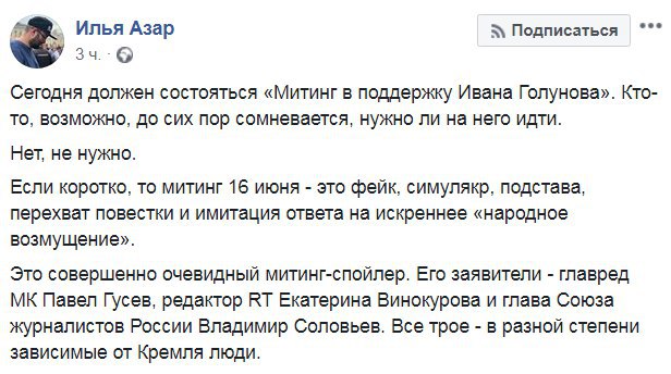 Сегодня в Москве опять пройдёт акция в поддержку Голунова. На этот раз согласованная. С участием многих приличных людей. Под чудесным лозунгом «закон и справедливость для всех».