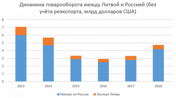 Так, в 2015 году экспорт из Литвы в Россию упал с 4,6 млрд до 2,9 млрд долларов, а импорт опустился с 1 млрд до 440 млн долларов.