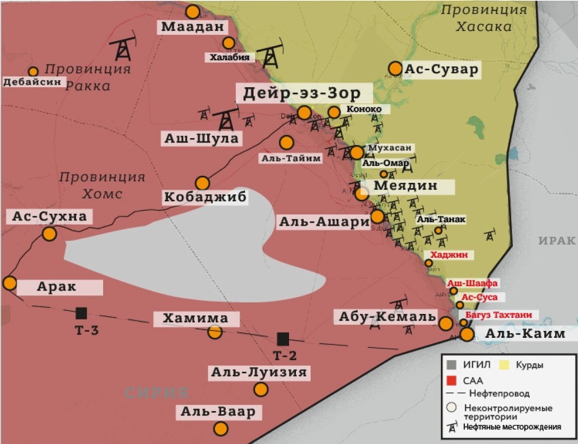 Уже к концу сентября подконтрольные курдским боевикам медиаресурсы объявили о взятии силами YPG ключевых нефтяных и газовых полей Аль-Эзба, Табия и Аль-Джафра к востоку от Дейр-эз-Зора. Но эксперты вскоре обратили внимание, что все объекты выглядят удивительно целыми и почти неповрежденными, хотя обычно исламисты ИГ принципиально разрушают всю инфраструктуру перед сдачей территорий.