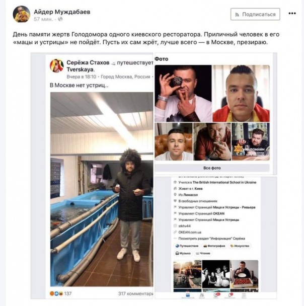 Итак, киевский ресторатор, владелец заведения «Маца и устрицы» посмел приехать в Москву. Более того, в День памяти жертв Голодомора он не постыдился запостить на своей странице фото с устричной фермы в Москве.