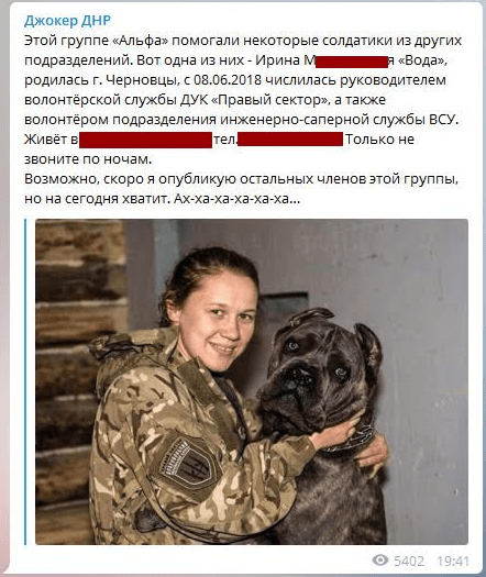 Фронтовой волонтер «Liliia Virovkina» обращает внимание Службы безопасности Украины на то, что пользователь «телеграмма» “Джокер ДНР” получает и обнародует секретную информацию об Объединенных силах и конкретных бойцах ВСУ и СБУ. Естественно, тревожит первое – где враг берет, на первый взгляд, секретную информацию. Похоже, завелась «крыса» или несколько; возможно в штабе ООС, поскольку сливается информация о разных силовых структурах.