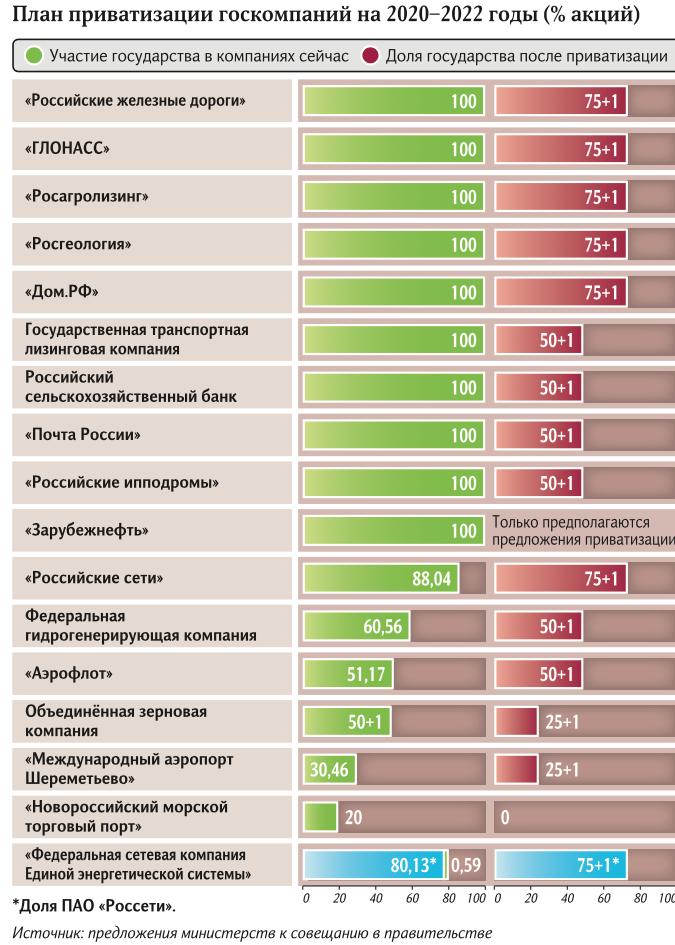 Подробности нового плана приватизации на 2020–2022 годы выяснили «Известия». На совещании у первого вице-премьера, министра финансов Антона Силуанова 10 декабря рассматривалась возможность отчуждения 25% акций РЖД и госкорпорации «ДОМ.РФ», а также 50% «Почты России» и Россельхозбанка («Известия» ознакомились с предложениями ведомств). В «Аэрофлоте» участие государства может снизиться на 1 п.п., в аэропорту Шереметьево — на 15 п.п., а из уставных капиталов «Продинторга» и Новороссийского морского торгового порта правительство может выйти полностью. При этом свою долю РФ планирует сокращать не только с помощью продажи акций, но и посредством дополнительных эмиссий. Впрочем, в большинстве организаций контроль всё равно останется за государством.