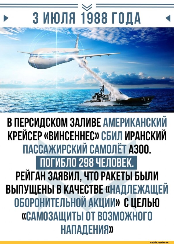 1988 год. Над Персидским заливом американским крейсером «Винсеннес» был сбит иранский пассажирский А-310. Погибли 298 пассажиров и членов экипажа.