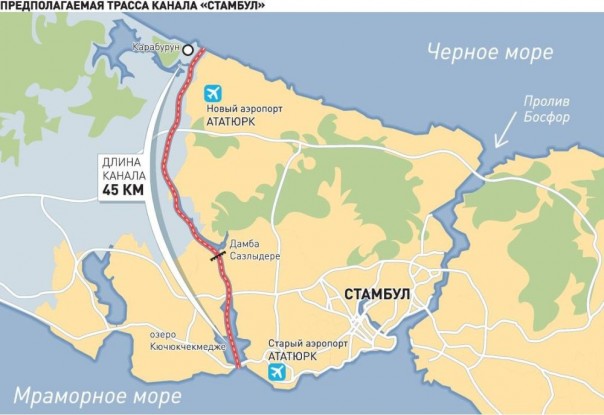 Строительство новой водной артерии в обход Босфора может стать крупнейшей инфраструктурной инициативой в истории Турции. Согласно проекту, новый канал должен разгрузить пролив Босфор, через который каждый год проходит более 50 тысяч судов, в том числе танкеры с нефтью. Канал предполагается проложить параллельно Босфору, западнее города Силиври. Строительство должно быть завершено к 100-летнему юбилею со дня основания Турецкой Республики в 2025 году.