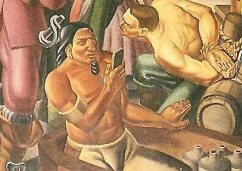 Умберто Романо, умерший в 1982 году, также отметился на этом поприще, аккуратно нарисовав легко узнаваемый в 21 веке айфон в руках средневекового индейца.