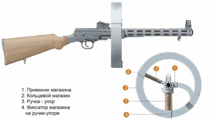 Скорострельность была очень большая – 1000 выстрелов в минуту. А вот о емкости магазина разные источники пишут по-разному, можно найти и 22 патрона, и 44. Для дискового магазина, конечно, мало, тем более при такой скорострельности.