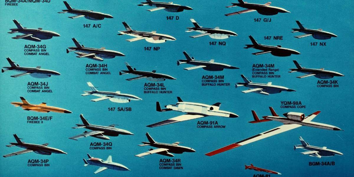 Множество самых различных типов дронов, производимых фирмой Ryan в первой половине 70-х. В правом нижнем углу — ударный BGM-34