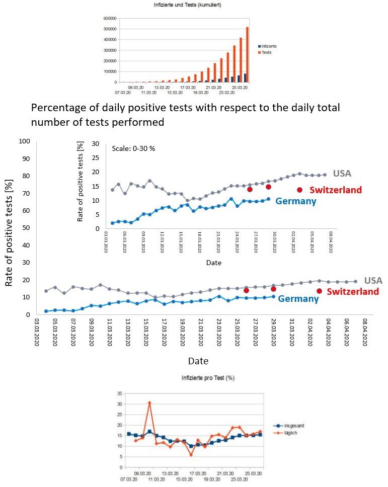 Дело в том, что число тестирований во многих странах увеличивается в геометрической прогрессии. В большинстве стран соотношение положительных тестов к общему количеству тестов либо является постоянным (5-15%), либо растёт очень медленно. Швейцарский медик Феликс Штолькман приводит соответствующие данные по США, Германии и Швейцарии.
