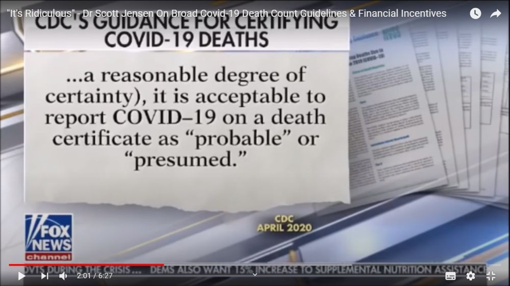 Дженсен сказал, что получил документ на 7 страницах с инструкцией, указывающей, как надо заполнять свидетельства о смерти с диагнозом COVID-19 без лабораторного теста, подтверждающего, что у пациента действительно был вирус. Врач должен написать, что смерть пациента произошла, возможно (probable) или предположительно (presumed) от коронавируса. Те больницы, которые будут следовать инструкции, получат в три раза больше денег. Дженсен продемонстрировал инструкцию в прямом эфире.