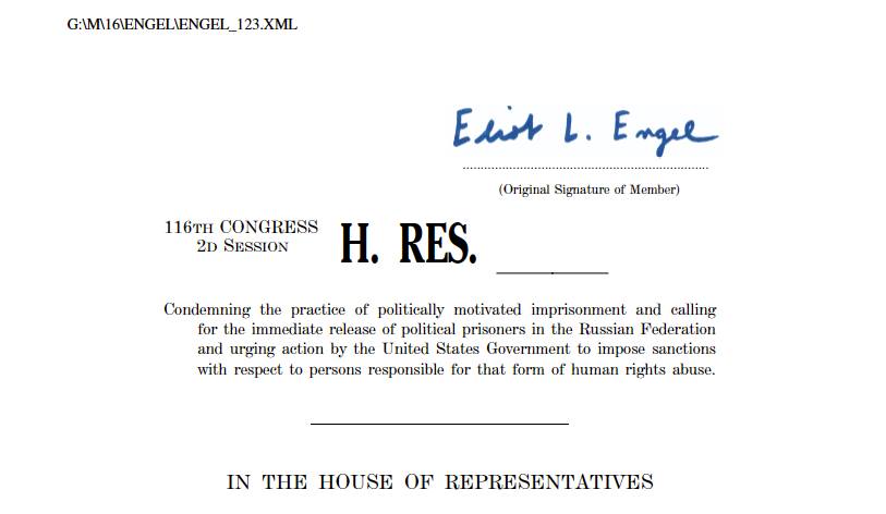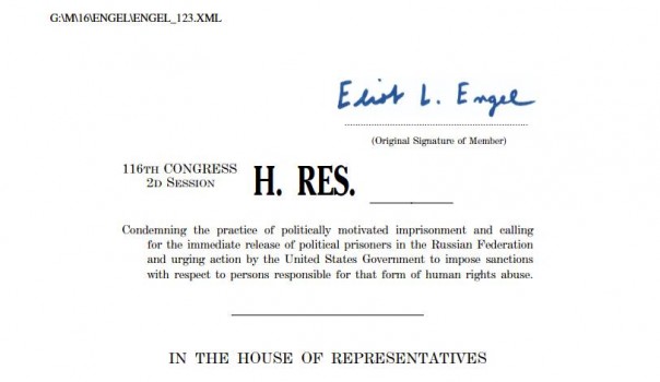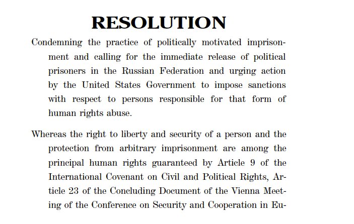 «Осуждая практику политически мотивированных тюремных заключений и призывая к немедленному освобождению политических заключенных в Российской Федерации, и настоятельно призывая правительство Соединенных Штатов принять меры в отношении лиц, ответственных за эту форму нарушения прав человека».