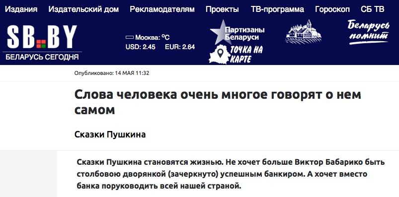Интересно, что одновременно с обвинениями в адрес Бабарико в сотрудничестве с грантоедами (вроде «Нашей Нівы») появляются сообщения о его «пророссийской» ориентации – оппозиционная пресса задаёт ему вопрос: «Чей Крым?» Выдвинулся в поход за президентской должностью и основатель белорусского Парка высоких технологий Валерий Цепкало, но, говорят, они с Виктором Бабарико будут играть на одном поле.