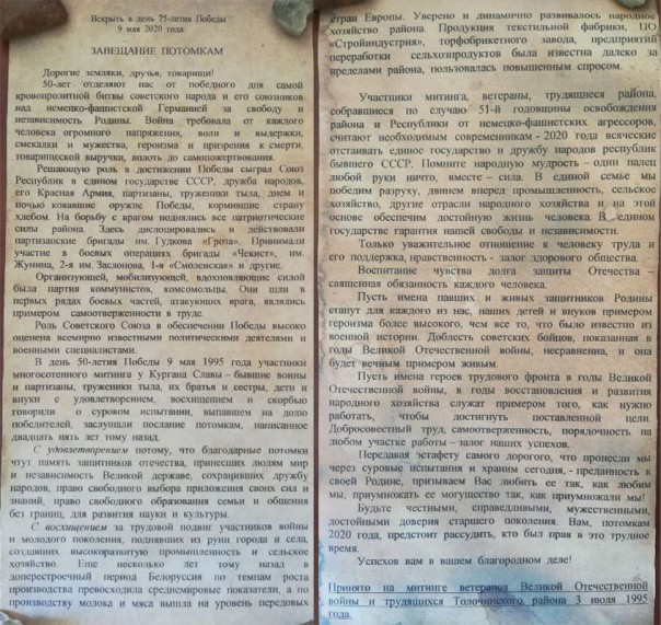 Внутри капсулы, которую вскрывали глава районной организации Белорусского союза офицеров Алексей Якименко и почётный гражданин Толочинского района Михаил Завадский, нашли текст – «Завещание потомкам». Вскрыть капсулу ветераны Великой Отечественной, большинству из которых тогда, в 1995-м, было около 75 лет, наказали в День Победы 2020-го, через 25 лет, когда практически никого из писавших «Завещание» уже не будет в живых.