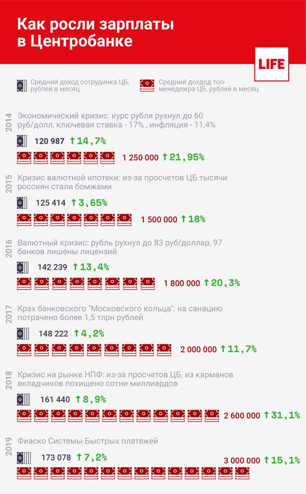 Вообще, из расчётов Лайфа следует, что чем мощнее финансовый кризис в стране, тем больше вырастает зарплата топ-менеджеров, которые, собственно, и занимаются регулированием этих самых финансов. Так, впервые значительное (аж на 22%) повышение доходов руководства Центробанка состоялось в кризисный 2014 год, когда на финансовых рынках царила паника, ключевая ставка была поднята аж до 17%, а национальная валюта обесценилась почти в два раза — до 60 рублей за доллар. В 2016 году, когда курс доллара пробил планку в 83 рубля за "зелёный", руководители ЦБ подняли себе зарплату ещё на 20%. При этом, согласно закону о ЦБ, обеспечение стабильности национальной валюты — основная задача регулятора.