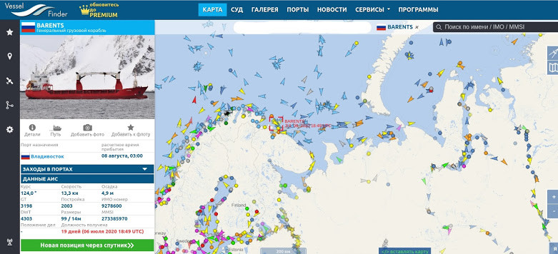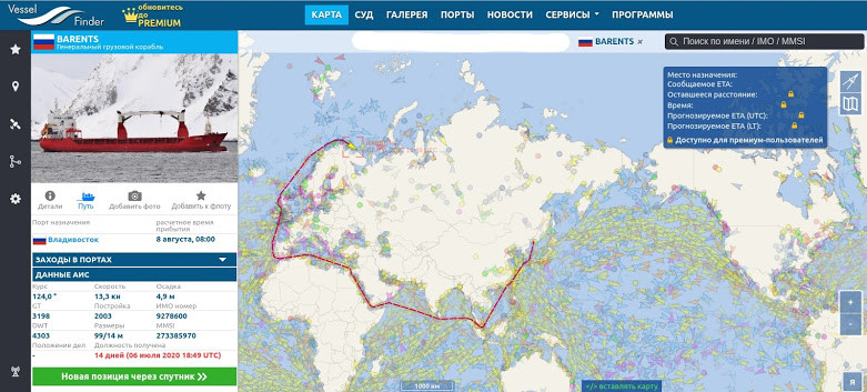«Баренц» вышел из Северодвинска в середине июня, идёт хорошо, где-то 10 узлов и без ледокольного сопровождения, в настоящее время прошло Новосибирские острова, а это 4/5 пути до Берингова пролива. Роскосмос молчит и не пиарит, системы слежения отображают последнюю точку судна недалеко от Мурманска ещё только на подходе к Северодвинску, на чём координаты и застыли. Причины молчания могут быть разные, в том числе «как бы чего не вышло» (из-за сложности задачи), но ничего секретного в операции нет.