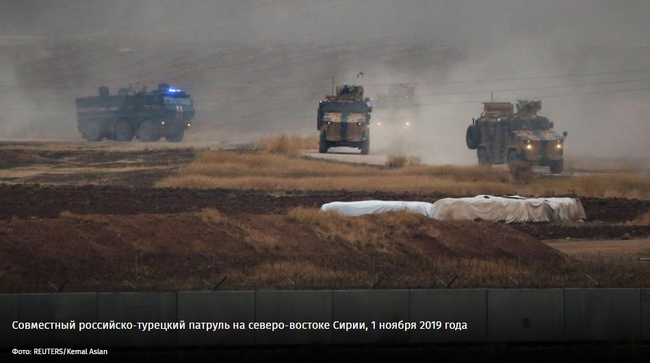 Российские военные полицейские с октября 2019 года совместно с турецкими коллегами патрулируют в Заевфратье десятикилометровую зону безопасности вдоль границы Сирии и Турции. Центр по примирению враждующих сторон РФ сообщает, что патрули регулярно посещают отдалённые районы для сохранения мирной обстановки в регионах, подконтрольных правительственным силам. По согласованию с властями страны, для этого были созданы опорные пункты на нескольких базах, опустевших после ухода американцев.