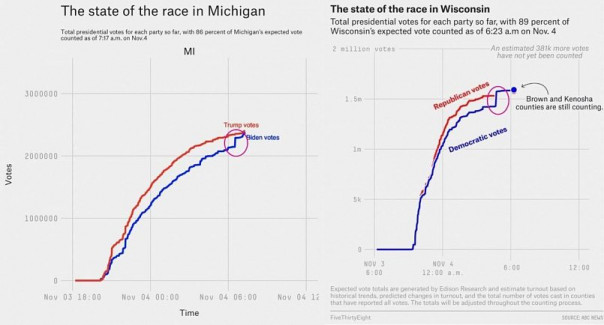 То, что произошло дальше, совершенно точно станет предметом судебных разбирательств. В Висконсине и Мичигане лидерство внезапно перехватил Байден. Причем при динамике рейтинга кандидатов это выглядит очень странно. В обоих спорных штатах представитель демократов буквально одномоментно набрал большое количество голосов. Эти скачки сразу бросаются в глаза, если посмотреть на график. Кстати, произошли они примерно в одно время — чуть позже и чуть раньше 6.00.