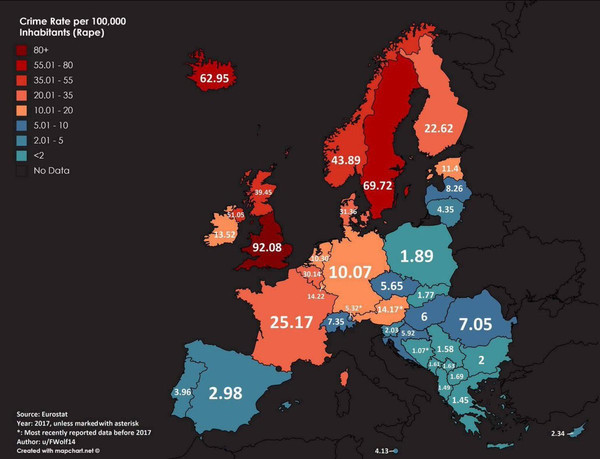 Впрочем, лучше и нагляднее всего о криминогенном состоянии Евросоюза расскажет «Карта изнасилований в Европе»: