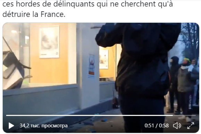 На видео, размёщенном в "Твиттере", видно, как люди в масках и капюшонах атакуют полицейских, бросая в них коктейли Молотова и булыжники, стреляют в витрины магазинов из винтовок, направляют на полицейских лазерные указки. Человек, разместивший видео, пишет, что это происходит теперь в Париже каждую субботу.